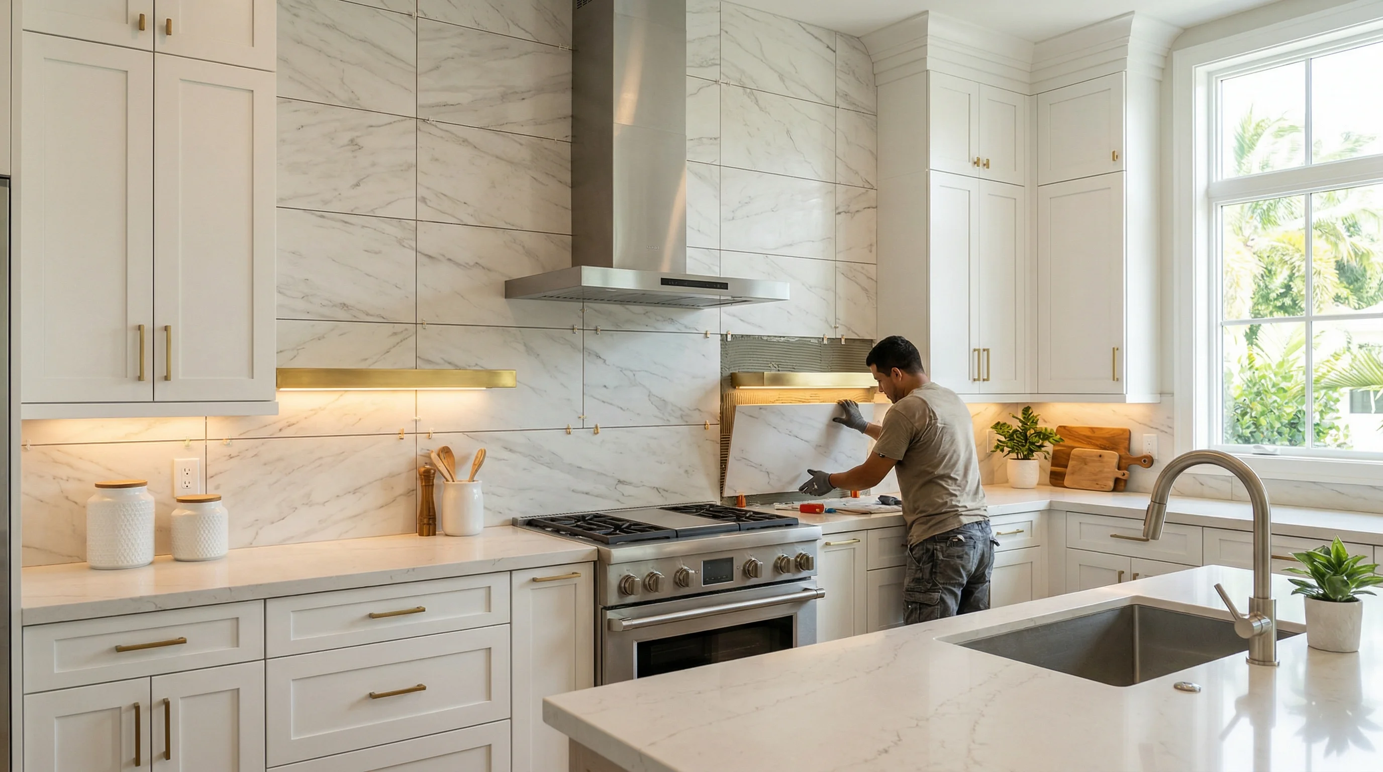 Labor in Palm Beach County typically runs $8–$15 per square foot for standard tile, higher for natural stone or intricate patterns. Most kitchen backsplashes are 25–40 square feet total.