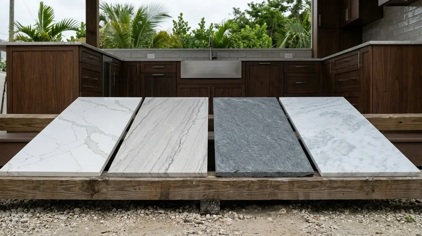 Outdoor kitchens: Quartz is not suitable for outdoor kitchens under any circumstances — the resin fails under UV. Granite and quartzite are the standard choices for South Florida outdoor kitchens. See our outdoor kitchen materials guide for full recommendations.
