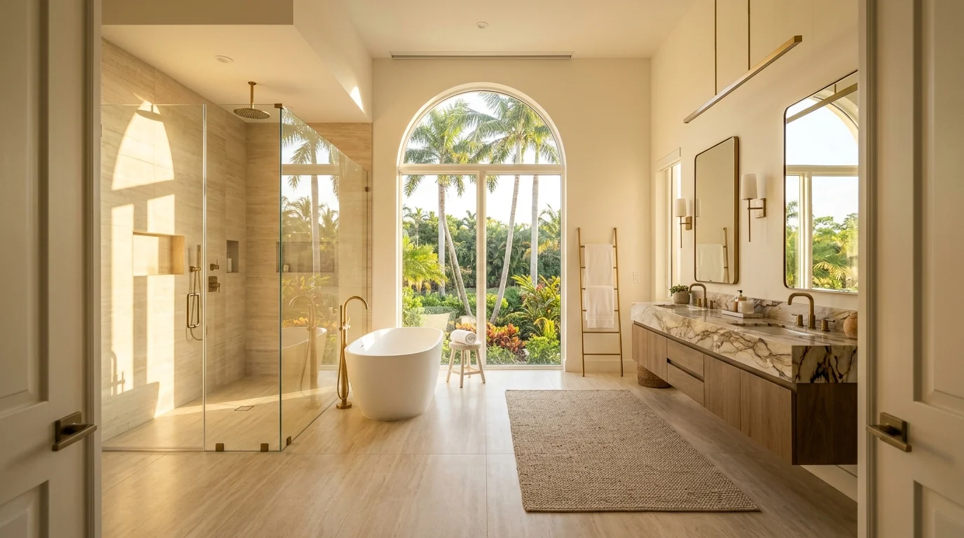 Curbless showers work exceptionally well in South Florida's single-story ranch and Mediterranean-style homes. The continuous floor plane makes bathrooms feel twice their actual size. We recommend this approach for master baths over 80 square feet where you have room for proper water management.