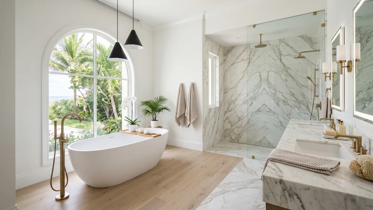 Most Palm Beach Gardens projects also benefit from being newer construction — slab foundations with accessible plumbing clean-outs, truss roofs with open attic runs for vent hoods, and pre-wired 200-amp panels with circuit space. That makes electrical and plumbing rough-ins faster and avoids the surprise costs common in older coastal homes. For more on this, read the 2026 bathroom remodel design ideas our high-end clients are choosing on our blog.